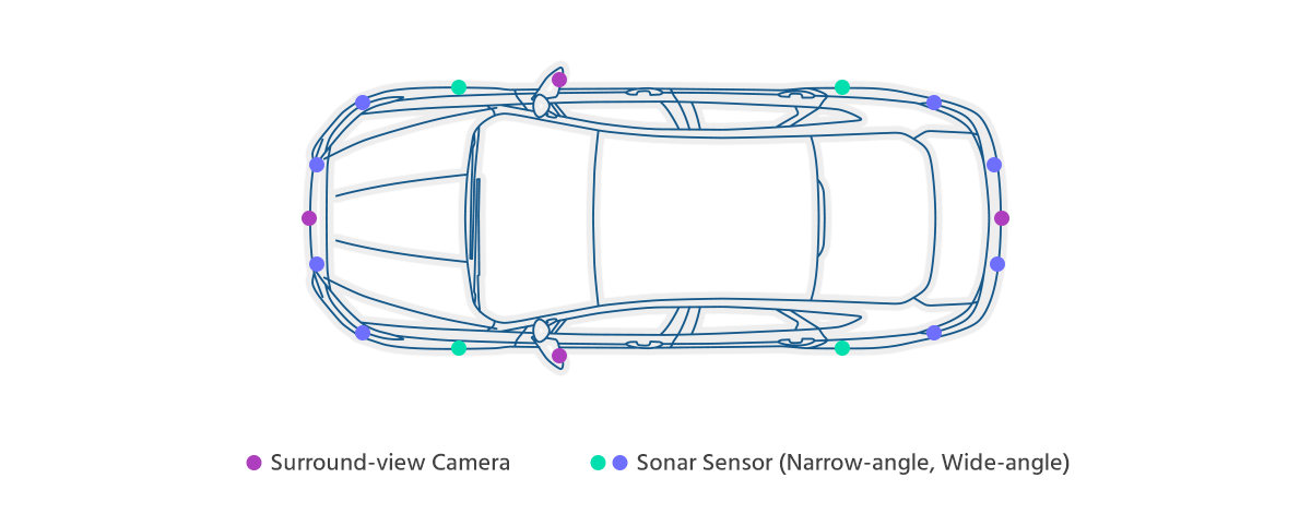 Figure 2: Deployment locations of surround-view cameras and sonar sensors