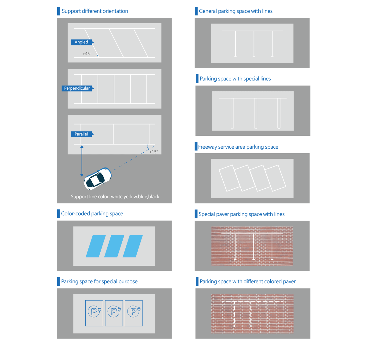 Figure 3. oToBrite’s Vision-AI APA system supports over 100 parking space types with diverse layouts and surfaces.